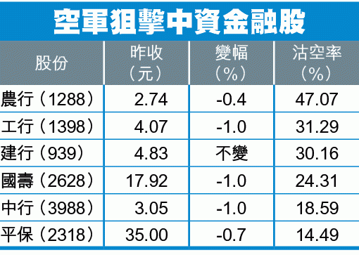 事實上,中資金融股近日弱勢明顯,昨多隻內銀及內險均跌逾1%,除農行外,工行昨亦跌1%,沽空率由個位數飆上31.3%,建行昨沽空率亦衝上三成。另外,盈富基金(2800)沽空率亦持續高企,昨錄47.4%,已連續五個交易日高於四成,反映市場對沖情緒仍活躍。