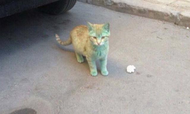 據英國《Daily Mail》報道,保加利亞曾有隻好出名的綠毛貓,兩年前火紅起來的牠,被當地人懷疑遭虐待,更成立facebook群組聲討搞惡作劇的人。不過有人發現陸續有不同程度的綠色貓出現,經明查暗訪後方知道原來這堆綠毛貓都愛睡在廢棄車場的屋頂上,久而久之就沾上了綠色油漆。當時,該國防止虐待動物協會(RSPCA)就呼籲民眾速速捉拿有關貓咪,為牠們清洗油漆,以防中毒。