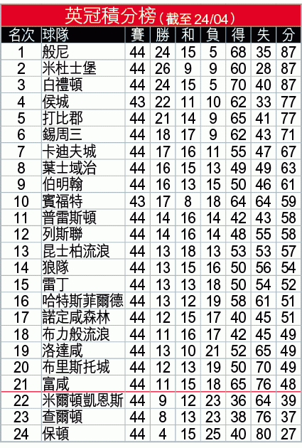 至於目前排第10位的賓福特,今役對他們來說亦是「例行公事」,不過,球隊戰意不俗,如上仗作客到要搶分護級的米爾頓凱恩斯亦一樣「冇面畀」,大勝4:1,令球隊近六仗共取得五勝一和,其中前鋒拉斯維比及中場沙治簡奴斯等均腳風頗順,加上傷癒復出的前鋒史葛賀根又不時能後備入替建奇功,今役就算作客,相信亦能取得入球。
