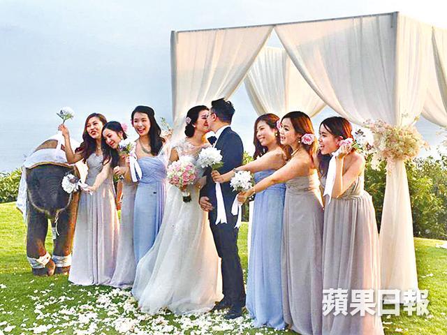 不過,原來王傲山早有部署,他昨日選擇在泰國布吉的Paresa Resort跟Janny舉行浪漫婚禮。懷孕4個多月的Janny披上白色婚紗,跟穿上西裝禮服的王傲山在搭建的白色帳篷行禮,最特別之處,是現場還有一頭小象現身婚禮,逗得一對新人及賓客開心不已。