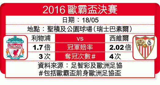 紅軍在決賽的對手是過去兩屆歐霸盃冠軍西維爾,後者於周四在主場以3:1擊敗薩克達,兩回合計贏5:3連續三年殺入決賽。西維爾無疑是「歐霸之王」,連同前身歐洲足協盃,至今紀錄性四次殺入決賽皆順利奪冠;這邊廂利物浦在歐協盃戰績亦十分理想,在1973、76以及2001三入決賽全部贏得冠軍。莊家亦較為看好紅軍,被列為1.7倍歐霸盃奪冠熱門。