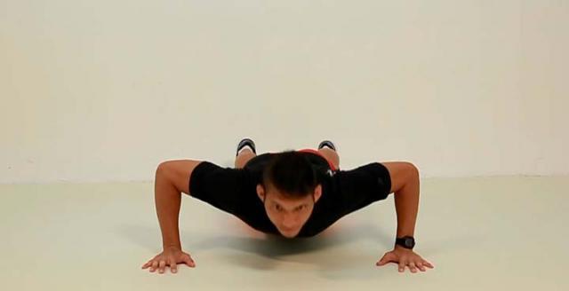 先來第一個動作,和掌上壓差不多,雙手比膊頭闊一點撐着地面,以掌上壓方式下去之後用爆炸力「彈」上來,上來時將兩隻手掌放中央,再將雙手變回膊頭闊度,下去同樣闊手,不斷重覆動作,這樣便可以增加我們的肌肉負荷。下一個動作亦是掌上壓的動作,是為了增加肌肉的發力時長,用四秒下去,然後一下子上回來,這個動作可以令肌肉有更多時間處於拉力狀態,某程度上亦有增加負重的感覺。