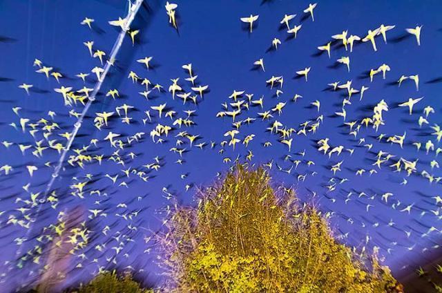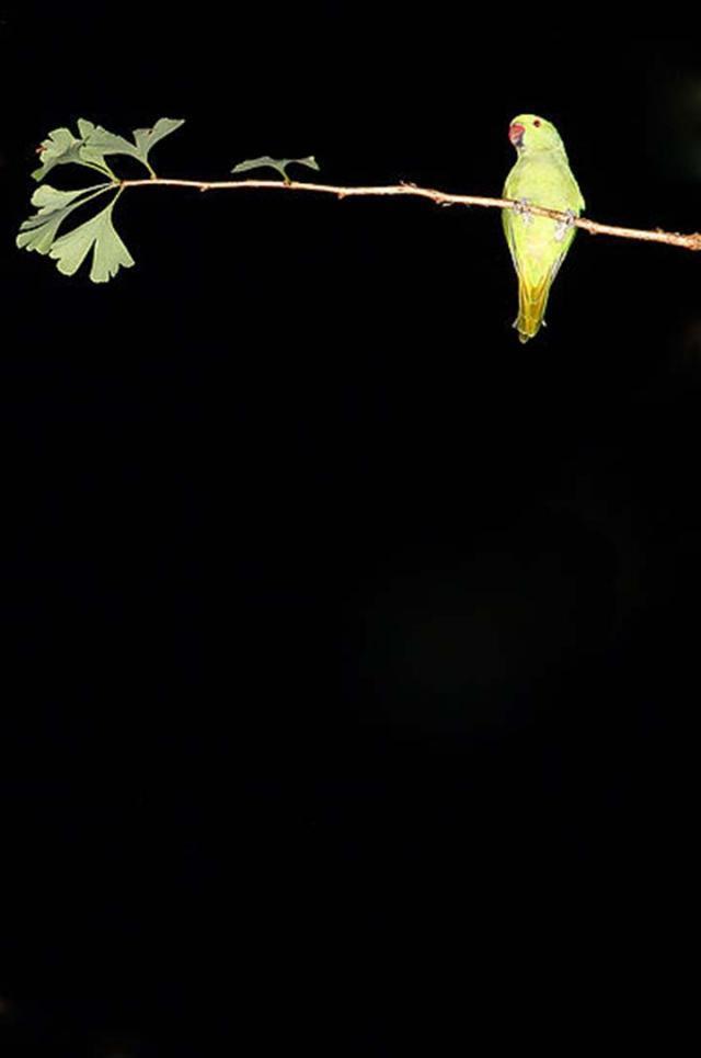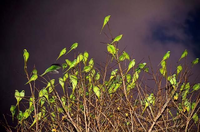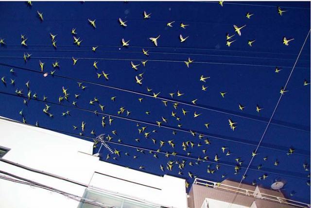 不僅中環街市有群鳥聚集,東京的天空每日同樣有一大群綠色鸚鵡佔領天空,現年29歲的日本攝影師水谷吉法(Mizutani Yoshinori)被這群鸚鵡吸引,以一年時間追蹤鸚鵡的飛行痕迹,終於在東京目黑區的一棵銀杏樹發現牠們的大本營。他以鏡頭捕捉這些野生鸚鵡的生活,鸚鵡時而站在電線杆上,時而在黑夜裏螢螢發光,甚有詩意,攝影師也憑這系列《Tokyo Parrots》作品成名,去年也曾在蘇富比畫廊舉辦聯展。