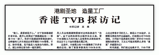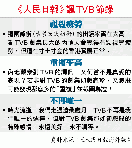 《人民日報海外版》昨於第3版《要聞.台港澳》,刊登一篇題為《港劇聖地 造星工廠 香港TVB探訪記》報道,該報記者跟隨TVB內地事務高級主任董蓬參觀古裝街及民初街,文章表示,「由於這兩條街的出鏡率實在太高,看TVB劇集長大的內地人會覺得有點視覺疲勞」。不過,「暗寸」TVB後,文章亦體面地打完場,緊接一句「但這在寸土寸金的香港實屬正常」。