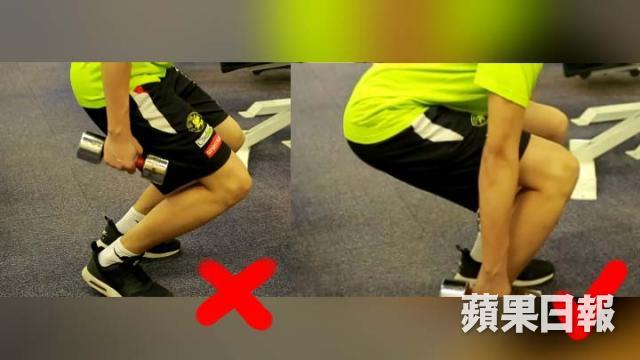 而另一個較常見的錯誤動作就是深蹲,不少人做深蹲時都會將膝頭向前傾,但這樣會令身體很多力聚在膝關節,其實是錯的。正確動作應該是首先腳要分開跟膊頭同寬,腳尖指向前,重量放兩邊,再慢慢向後坐,腳踭保持貼地。留意腰腹要直,重點膝蓋不要壓前,可以坐多後就坐多後,這樣就可避免膝蓋受傷。