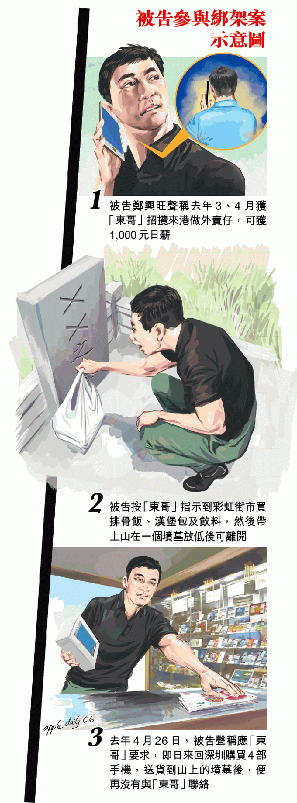 5月3日,被告圖經羅湖返回內地時被捕,他警誡下聲稱,約在3、4月,一名叫東哥的人以1,000元日薪招攬他來港送外賣。他到港後,獲分配八達通卡、5,000至6,000元現金,他按指示到彩虹的街市買排骨飯和漢堡包,亦幫手買電話卡,帶到山上一個墳墓放低就走,收了3,000元酬勞。4月26日他應東哥要求回深圳買4部手機,即日來回,之後他再沒有聯絡東哥。直至他在報紙有關綁架案的報道看到自己相片,才知出事想逃走,安排偷渡回內地不果,惟有用正途,結果被捕。