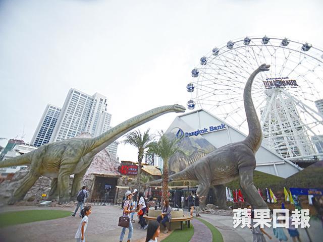 年初網上一條短片廣傳,貨車尾放了隻識郁的暴龍,大搖大擺走在曼谷街頭,原來是新主題公園的預告,未開幕先轟動。難得唔使去華欣芭堤雅,樂園就位於市中心黃金地段,BTS Phrom Phong 站一出,就見到大大個摩天輪,仲有將條頸伸到2樓咁高的腕龍。號稱用了5億泰銖(約1.1億港元)建造,園區卻只有約12,000平方米(約3.5個標準足球場),比上年臨時搭建的荔園還細。咁多錢,用咗喺邊?樂園公關Shin表示:「睇吓我哋啲龍,好真㗎!」