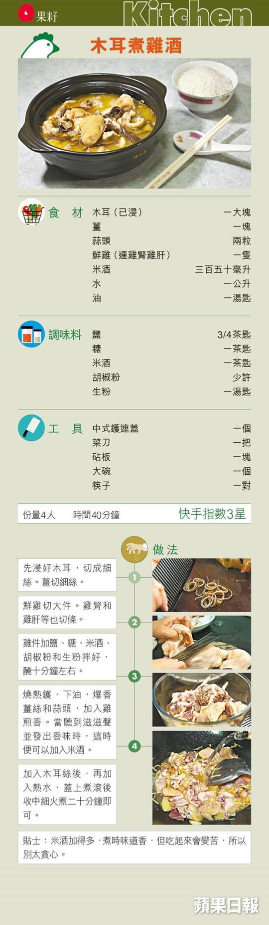 【飲食籽:一家之煮】木耳煮雞酒是種神奇的菜式,想起滲着雞肉香的酒湯便會自動令人食慾大增。陳媽媽的木耳煮雞酒用米酒煮,她說糯米酒太補,不適合這季節食。她提議以一碗米酒加三碗水的比例來煮,不辣又不苦。