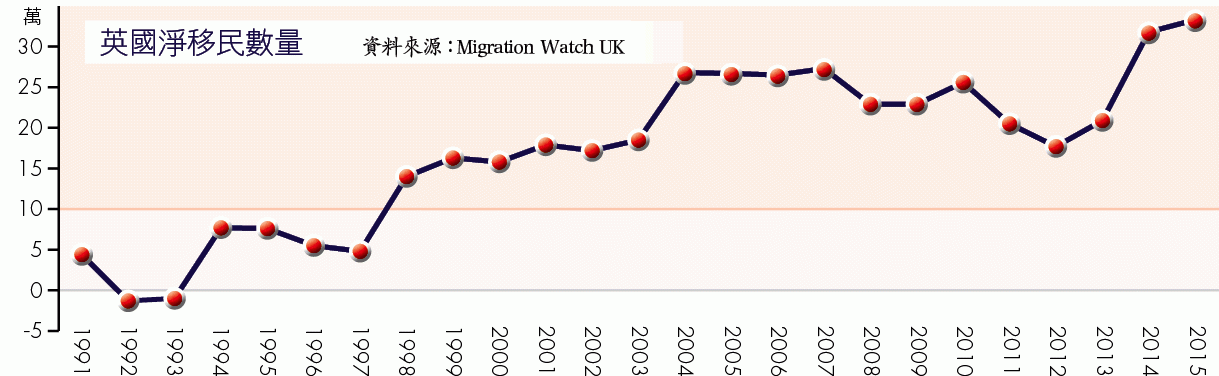 1991至1997年期間,英國淨移民數量是低於10萬人,甚至在1992年和1993年出現負數。但自1998年至今淨移民數量一直高於10萬人,至2015年更急升至33.3萬,從近年淨移民數字的上升走勢,試問英國人又點會相信卡梅倫的承諾可以實現呢?