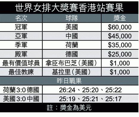 中美大戰停不了,雙方將於下月六號在曼谷展開的大獎賽總決賽再有機會碰頭,除中、美外,總決賽的六支參賽球隊還有巴西、俄羅斯、東道主泰國及荷蘭,後者昨日頭場以3:0擊敗德國,成為最後一支闖入總決賽球隊。