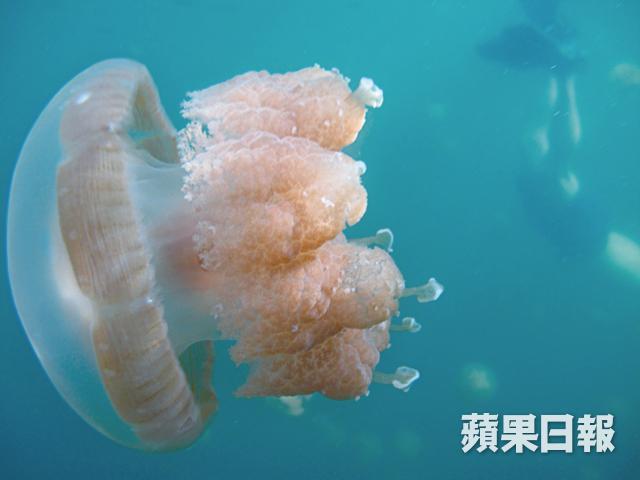 這時,陽光灑落湖泊的中間,人們就朝着光芒游去。在陰暗的湖邊已見零星的水母飄浮,漸漸只見密密麻麻的水母自十幾米水深之上飄蕩。水母半透明又渾圓的身體不斷脹起來又縮一點。我把手溫柔地往牠們的圓頂滑過,覺得好像是摸上豐富具彈力的乳房一樣。