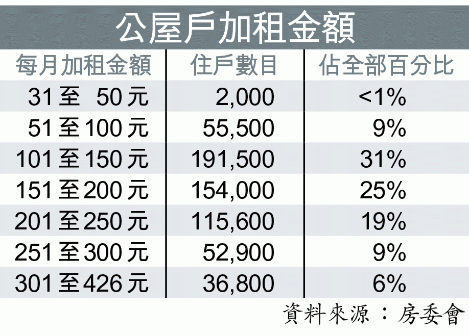 【本報訊】房委會完成最新一次公屋租金檢討,結果顯示公屋居民過去兩年收入增加16.11%,但按法例最多只可加租10%。消息指加租一成後,公屋戶平均每月要多付約170元租金,當中逾3成更加租201元或以上。房委會本財政年度公屋營運赤字高達15億元,消息指加租後赤字可減至6億元,但若提供一個月免租,赤字會擴大至20億元,故現階段無計劃免租。