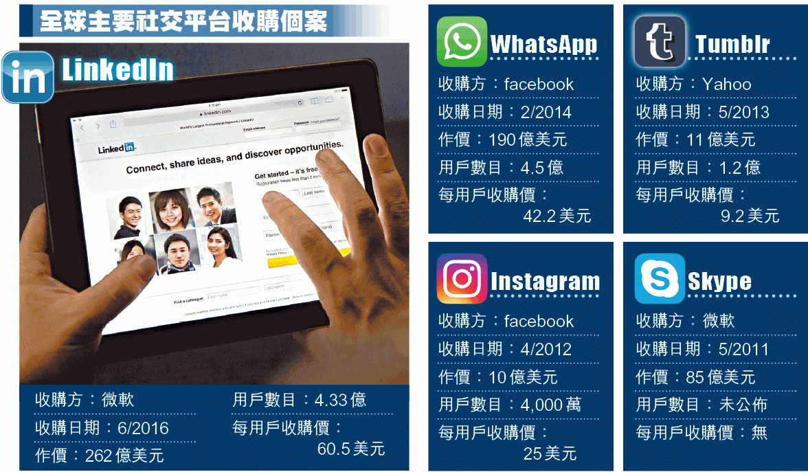 市場對專營Window及Office等軟件及雲端服務的微軟,以天價收購專業人士社交網絡LinkedIn感不解,商智謀略資深科技顧問馮德聰更表示,微軟在行內向來形象都是「人傻錢多」,「由互聯網開始,眼光一直唔係幾準」。撇開作價問題,是次收購已反映擁有大量用戶工作經歷的求職網站,亦開始取代獵頭或職業中介公司,成為專業人士搵工及轉工的主要平台。擁有本地最大招聘刊物《JobMarket求職廣場》的星島(1105)於年報中就提到,正投資網上招聘平台以結合旗下之平面刊物,預期將進一步為未來增長作出貢獻。