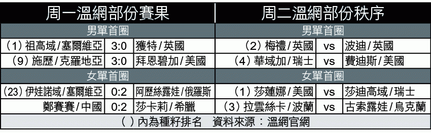 處於下風的鄭賽賽未知是否壓力太大,第二盤開局便遭莎卡莉打破發球局;這位中國「新金花」追成1:1後又再次失準,被對手將比數拉開至1:5。雖然背水一戰的鄭賽賽保住發球局,卻未能頂住壓力,最終苦戰個半小時便遭直落兩盤3:6、2:6橫掃,連續兩年在溫網首圈止步;她全場更錄得23次無壓力犯錯,比莎卡莉的12次多出接近一倍。同日另一場女單亦出現爆冷戰果,世界排名25的塞爾維亞球手伊娃諾域以直落兩盤2:6、5:7,不敵排223的俄羅斯小將阿歷絲露娃。