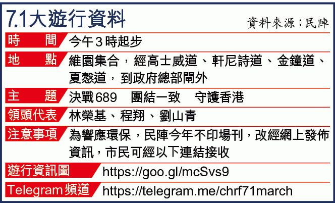 民陣今日以「決戰689 團結一致 守護香港」發起7.1大遊行,下午2時起在維園集會,3時正出發,因應早前發生迷你倉四級火致兩消防員殉職,遊行會加入要求政府盡快公開救火部署的訴求。今次遊行一反以往由團體或不同階層帶領遊行的做法,改由曾遭內地無理拘禁的3名港人,包括銅鑼灣書店前店長林榮基、程翔和劉山青領軍。