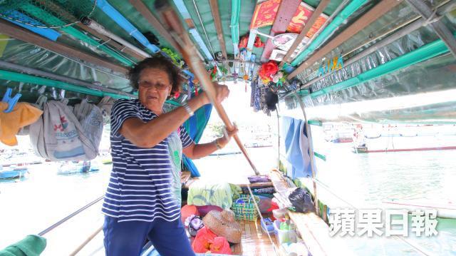 妹姐有一個很特別的名字,叫「袁初一妹」,最初我亦半信半疑,直至她將身份證遞給我看,並說:「因為呢個名,我成日被人笑係日本人,水上人唔識字,為咗易記,就將出生日期用嚟改名,不過,我都唔肯定自己係咪初一出世,阿媽可能亂嚟嘅。」說罷,她哈哈大笑。舢舨是她一個人的舞台,用一支十六呎搖櫓,雙腳紮馬, 雙手搖呀搖,眼看輕鬆得很。別以為搖櫓好簡單,記者試過撐5分鐘,剛好遇上強風,自問已出盡全力,但舢舨動也未動過一下。「你呢幾下都未認真拉嗰槳,你咁細力,船只會俾啲風吹番轉頭,行唔到啊!」妹姐半認真說。