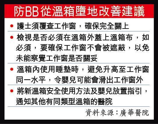 【本報訊】廣華醫院初生女嬰離奇從溫箱墮地事故,院方成立跨部門專家小組調查8星期後,昨日公佈結果,僅指出最有可能的肇事原因,是病房護士用遮光布覆蓋溫箱時,誤觸溫箱工作窗開關,令本已關妥的工作窗再打開,讓女嬰墮地。但醫院是否知悉誰人誤觸開關、有否追究責任誰屬,院方多番以警方正在調查為由拒絕交代。