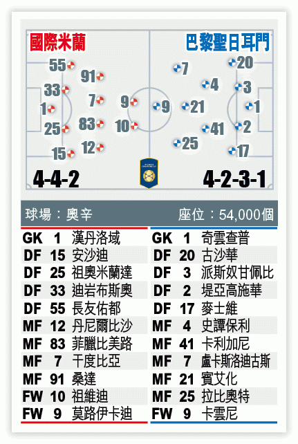 中場方面,來自西維爾的新兵班尼加沒有隨隊前往美國,而在今夏出戰歐國盃決賽周的比列錫亦未能候命。不過國米的人腳依然不弱,干度比亞與菲臘比美路截擊力強;還有活力十足的小將丹尼爾比沙與干高利等,今仗面對PSG有力一鬥。