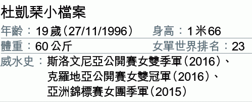 凱琹在2012年加入全職行列,早年在青少年賽都有不俗成績;不過,要取得奧運女單一席,就需要更多戰績去證明自己。她於四月舉行的里奧亞洲區外圍賽,以4:2擊敗中國一姐劉詩雯,凱琹說:「贏過這場之後,我會覺得沒有甚麼不可能。我能贏她也能贏其他對手。」