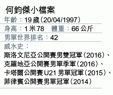 曾隻身到山東五年接受專業訓練的鈞傑,兩年前才回流香港加入港青代表隊,隨即在2014年菲律賓公開賽證明了訓練成果,取得成人組男單冠軍;一年後滿18歲升至港隊。確定了里奧名單後,他仍不相信這麼快便能踏上奧運舞台:「四年前我仍在山東看比賽,兩年前才回來,真的未有想過。」將以三號位出戰男團的他,雖然沒有率先舉行的單打作為熱身,卻有另一種看法:「所有三號位都在同一起跑線。或許我沒打單打,反而令信心不會下降太多,因為在奧運場上輸了,可能有很大打擊。」零經驗、年輕、具衝擊力,就是其優勢,鈞傑說:「再有經驗的人都會因懷疑自己而緊張,希望年輕的我有那種誰都不怕的精神去闖。」
