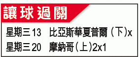 周三上演多場歐聯第三圈外圍賽次回合生死戰,法甲季軍摩納哥首回合不敵土超的費倫巴治,次回合返回強勁主場(紅白衫),且法卡奧回勇,可挫殘陣的客軍出線,讓半/一宜取上盤。(球賽編號:星期三20;無綫網絡電視301台明日2:45am直播)