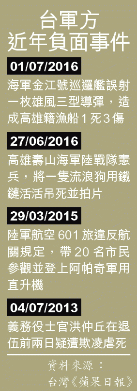 前年多名負責審核、驗收坦克履帶的軍官,涉每月收取2萬元(新台幣.下同,約4,844港元)的賄賂,讓不合格廠商在5年內取得近百件、總額逾15億元 (約3.63億港元)的履帶等軍品標案,國防部已將此案移送司法部門偵查。徐永明指5月時監察院的調查報告曾對陸軍司令部等通過糾正提案。國防部昨表示會徹查,不會隱瞞,今將對三名遇難官兵驗屍,釐清死因。