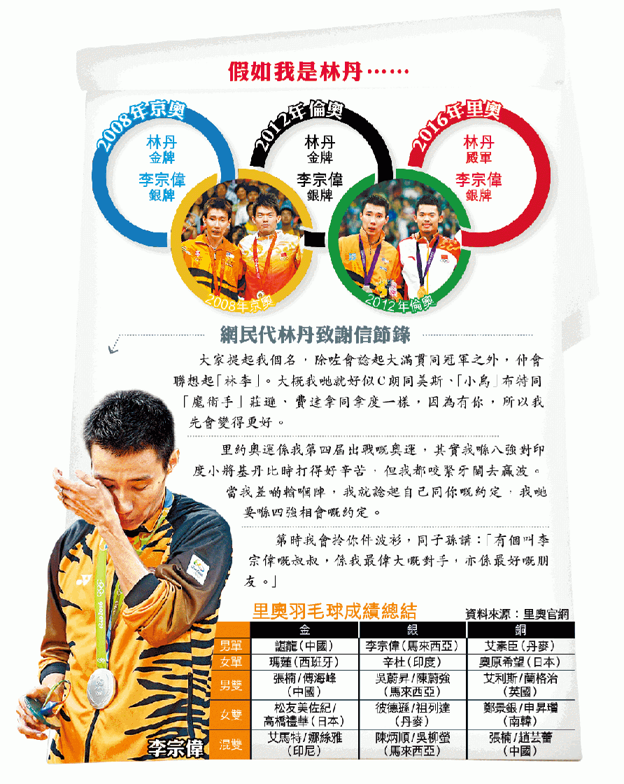 李宗偉同林丹自從成為職業球手,曾經37次交手,兩個互有輸贏;唔知由幾時開始,「羽客李林」嘅勝負亦開始牽動一班觀眾嘅心。眼見李宗偉終於喺里約奧運嘅男單四強贏到林丹,完場後互換波衫、擁抱對方,有網民亦決定將自己代入林丹,寫咗封信畀李宗偉,多謝佢同自己鬥足咁多年,令自己變得更好,就算贏盡冠軍都唔敢偷懶,因為佢會努力追趕。仲話可以遇到李宗偉係自己嘅福氣,將來一定要同子孫講:「有個叫李宗偉嘅叔叔,係我最偉大嘅對手,亦係最好嘅朋友。」寫到咁感人,唔講真係唔知原來係球迷代林丹寫。