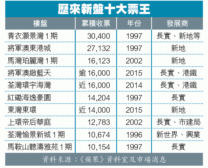 歷來新盤十大票王(見表),新地以及長實十席佔九席。新地更包攬前三位。第三是馬灣珀麗灣、第二是將軍澳東港城、第一位亦是新地有份、曾被稱為浩劫灣的青衣灝景灣,累積收票三萬張。