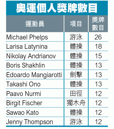 提到游泳項目,美國飛魚費斯剛剛拿到了他個人體育生涯中第23面金牌,總奧運獎牌數目達26面,是歷史之最。論個人奪金最多的選手,除費斯之外,其他首10名選手中,體操佔了五位,劍擊、獨木舟及田徑各有一名,餘下一位就同是美國泳隊的Jenny Thompson。這統計固然是反映個人能力,但同時亦顯示了體操和游泳都是有效率的奪標運動,國家只要栽培出一位超級體操明星,便有機會在不同的項目裏爭金。