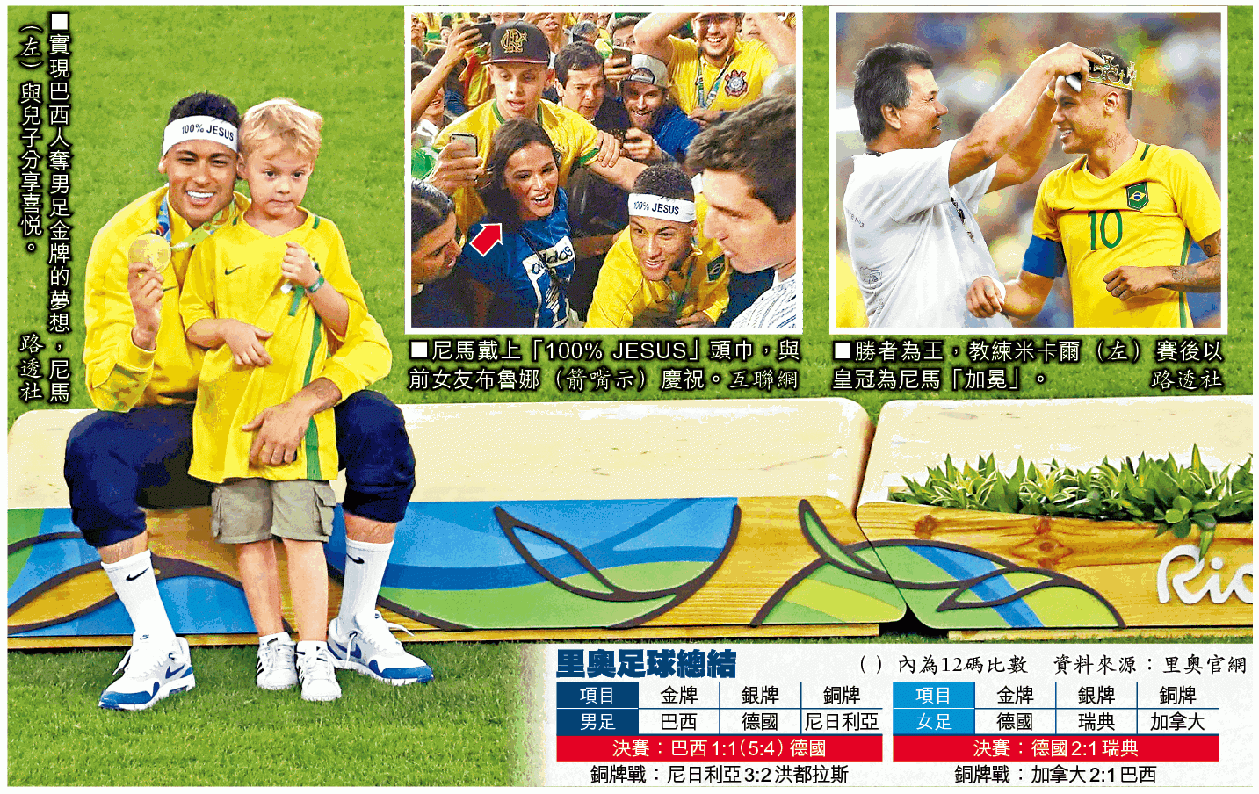 事實上,尼馬場外多姿多采的私生活惹來不少抨擊,甚至傳出帶領巴西出戰奧運的教練米卡爾,在賽事展開前曾考慮是否由他擔任隊長。尼馬賽後亦有作出回應,並透露不打算在國家隊續任隊長:「能成為隊長實在是莫大榮譽,但在奧運決賽後,我便不會再擔任這角色。」國家隊即將由新帥迪堤正式接任,後者將會選出新任隊長。至於德國雖然屈居亞軍,已造出歷來最佳成績;而同日較早前上演的銅牌戰,尼日利亞以3:2擊敗洪都拉斯,獲得一面銅牌。 綜合巴西外電
