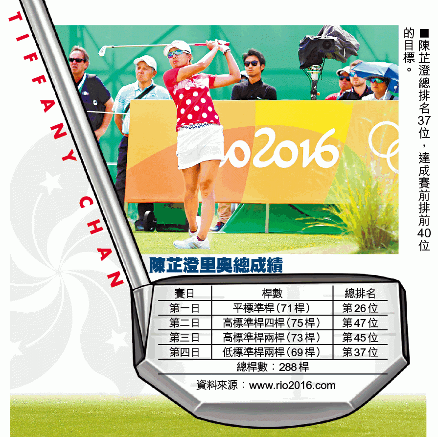 香港高爾夫球美少女陳芷澄(Tiffany),上周六完成里奧最後一天賽事後即晚起程到美國,參加LPGA美巡賽資格賽。最終一個賽日打出低標兩桿的69桿,造出四天中最佳成績,總排名升至37位的她,達成殺入40名的目標,賽後更成多國球迷「集郵」對象,風頭不遜奪牌選手,靚女果然贏在起跑線。