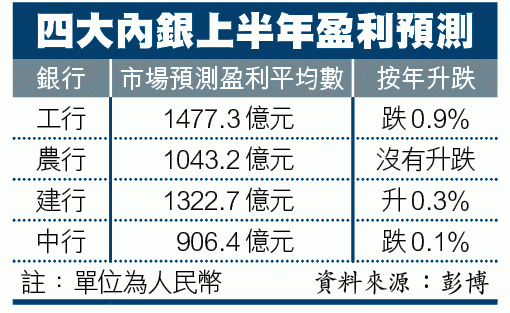 據彭博綜合內銀盈利預測,券商估計四大內銀盈利,由輕微倒退1%至增長1%不等。星展唯高達中國銀行業分析師陳姝瑾表示,內銀可透過提升撥備,及加強核銷不良貸款將撥備覆蓋率提高,前者將會對盈利受影響,不排除有銀行盈利或會因而倒退,但相信仍然會致力維持盈利增長。