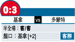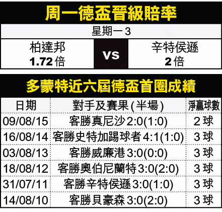 多蒙特雖然未能以最強陣容作客基拿進行德盃第一圈比賽,但在實力上仍高幾班,加上近年於德盃首圈從未試過失手,六戰全勝且有五次是淨贏三球或以上(見附表),故此「讓球主客和」[-2]當然仍值得捧場,必捧「客勝」,波膽取他們贏3:0及「客其他」。