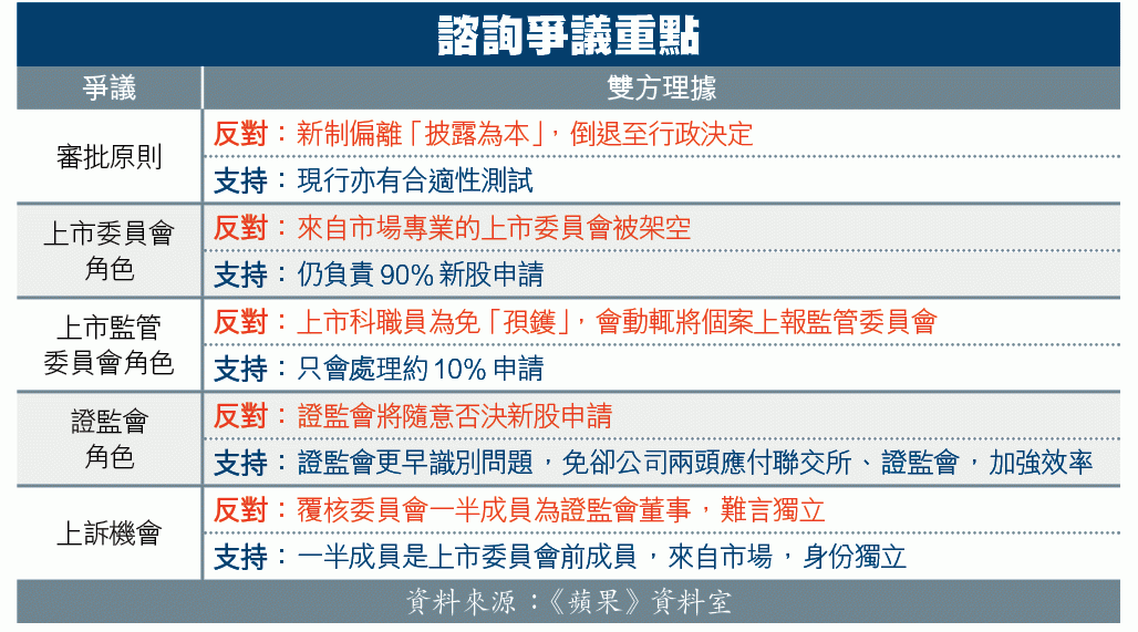 備受爭議的上市架構改革諮詢進入大直路!近年半新股股價頻頻暴升暴跌,玩謝股民,證監會、交易所聯合提出改革現有處理上市申請的流程,新制最大特色是證監會將提前參與新股審批,尤其針對具重大爭議或性質複雜敏感的申請,以至上市後監管的「疑難雜症」,兩機構可在同一委員會內討論,加快決策過程。不過市場反響極大,券商代表、上市公司商會等批評證監會只為爭權,證監會亦罕有反擊批評者理據不符事實,並由多名前任、現任財金官員出面護航。諮詢至9月19日,尚有一個月時間接受市場提出意見,尤其撞正立法會選舉,預料爭議將進一步升溫。