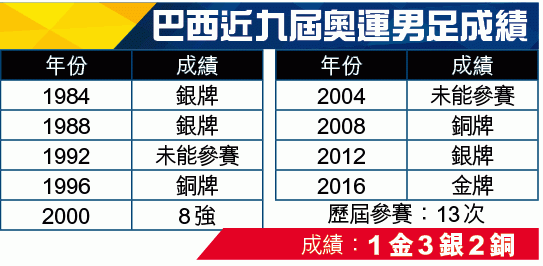 而2008年京奧,巴西由超齡球員朗拿甸奴領軍,戰至四強卻慘吞有美斯在陣的阿根廷三蛋,最終只獲銅牌。文:何西