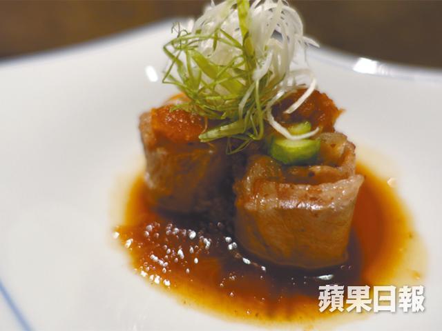 煮物方面就有火炙鰹魚伴青葱芝麻醬油汁、日式磯煮鮑魚、紅酒煮鮟鱇魚肝。大廚說紅酒煮鮟鱇魚肝需要兩天時間烹調,首天以紅酒及秘製醬汁烹煮魚肝,之後冰鎮待涼放過夜讓魚肝充份入味;第二天再把魚肝煮熱及調味。鮟鱇魚肝入口軟滑、滋味不輸法國鵝肝,卻沒有絲毫腥味或肥膩的感覺。燒物方面就有和牛牛蒡卷,和牛配上牛蒡、甘筍及露筍,之後加入蘋果茸及小量蔬菜茸,中和了和牛那一種油淋淋的感覺。