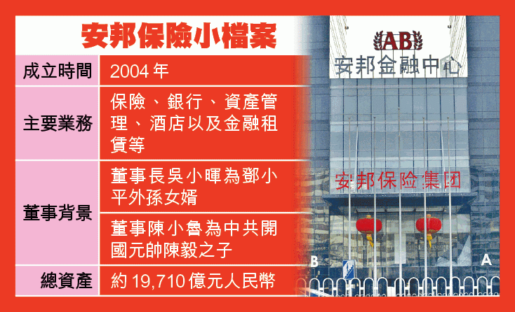 在紅二代光環下,安邦發展迅速,最初以56億元(人民幣.下同)收購總資產超過1,600億元的成都農商行35%股權,之後更接連收購金地集團、招商銀行(3968)、金融街、民生銀行(1988)等上市公司股權。安邦集團總資產規模現超過1.9萬億元。