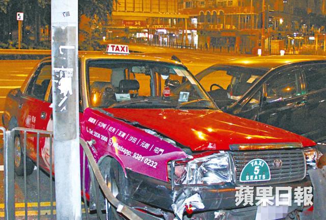 事發於昨凌晨近3時,姓陳(44歲)男子駕駛的士,沿海泓道往奧海城方向行駛,而姓呂(58歲)男子則駕駛一輛七人車,沿櫻桃街往大角嘴方向駛至,兩車駛至交界燈位,懷疑七人車司機「睇錯燈」,衝紅燈撞向的士左邊車身,並將的士推前撞向鐵欄及鏟上行人路,的士車頭損毀,泵把甩脫,約1米長鐵欄被撞毀。