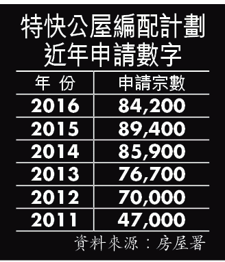 近年輪候公屋時間越來越長,不少基層家庭為加快上樓,甘願入住凶宅及鄰近垃圾房等不受歡迎公屋。過去三年特快公屋編配計劃申請宗數不斷增加,2013、2014及2015年分別收到7.67萬、8.59萬及8.94萬宗申請。