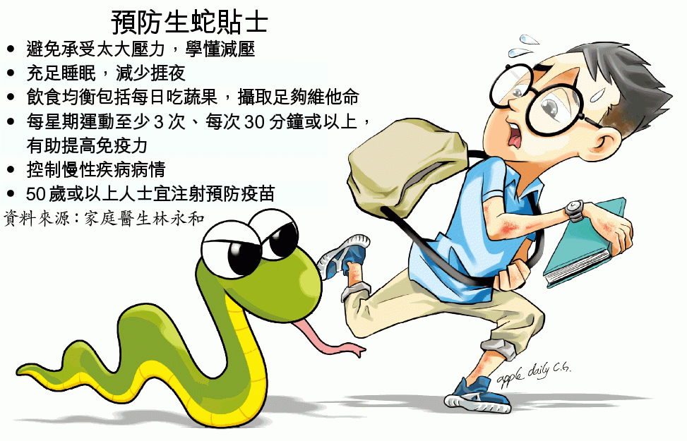 要預防生蛇,醫學界提倡50歲或以上人士可考慮接種預防疫苗。林指,年輕人則要從生活方面入手,提防免疫力降低,如要學懂減壓,並要保持充足睡眠,若已患傷風感冒反映身體免疫力轉差,更應要減少捱夜。慢性疾病患者如糖尿病、高血壓等,也是生蛇高危族,平日要控制好病情,提防生蛇有機可乘。