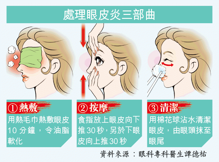 第一部為熱敷,即用熱毛巾放於眼皮上,進行10分鐘熱敷,熱力能令油脂軟化,並有助打開瞼板腺的油脂分泌出口,避免堵塞。第二部是眼部按摩,可用食指放在上眼皮,並向下推30秒,然後將食指放下眼皮,向上推30秒,以疏通瞼板腺的油脂出口,幫助排油。
