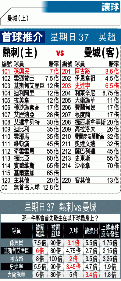熱刺本輪前排第二位,今季英超六戰失三球,是防守最好的球隊,但今季欺善怕惡,對強隊成績一般。再者,熱刺最近受傷兵困擾,英格蘭國腳哈利卡尼肯定缺陣,料由雲遜贊臣頂上,大大減弱前線的威懾力。此外,迪比利、穆沙施素高、艾歷迪亞及丹尼路斯等將亦上陣成疑。