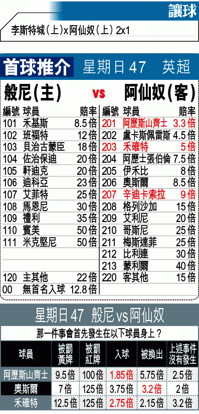 阿仙奴在周日英超作客般尼時,雖然要讓一球/球半,但他們近來勢如破竹,而般尼又續缺射手安達格雷,因此兵工廠的上盤仍然可捧。(球賽編號:星期日47;now621台及樂視今日11:30pm直播)