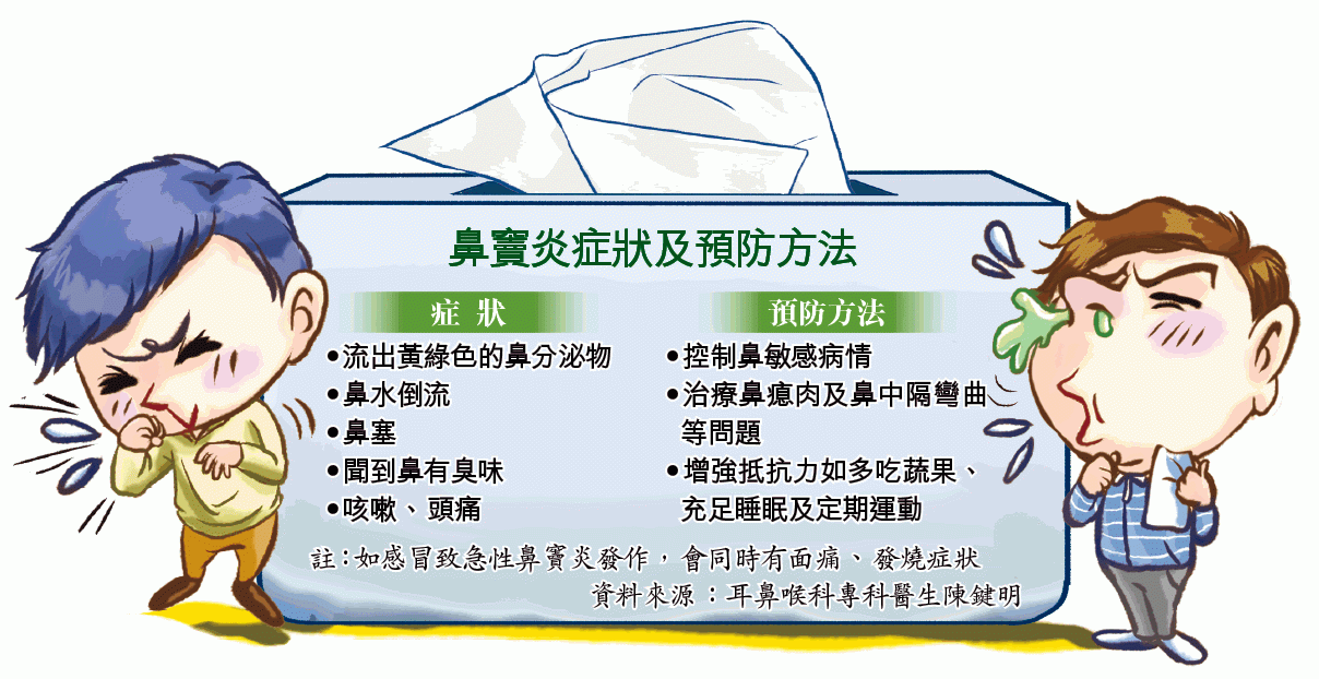 陳指,傷風感冒一般除了有上述病徵外,還會同時有其他常見症狀如喉嚨痛、發燒、周身骨痛及十分疲累等。鼻竇炎症狀則主要與鼻相關,包括病人會明顯流出黃綠色的鼻涕(因細菌感染引起的分泌物),並會聞到分泌物的臭味,其他症狀包括鼻水倒流、頭痛。鼻竇炎病人較少出現喉嚨痛、疲累等傷風感冒有關症狀,呼籲病人有懷疑症狀應及早求醫。