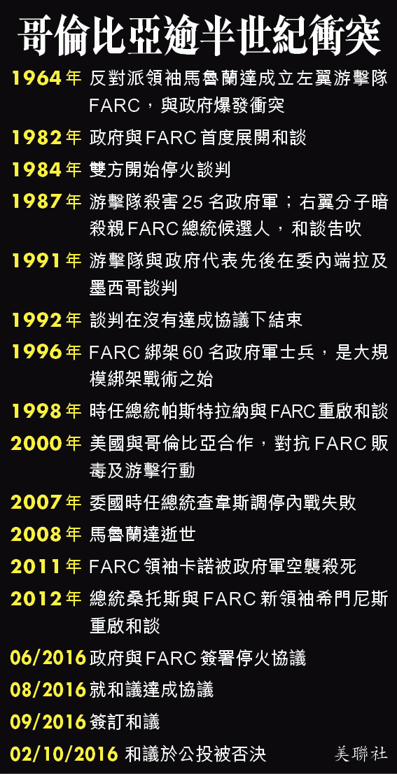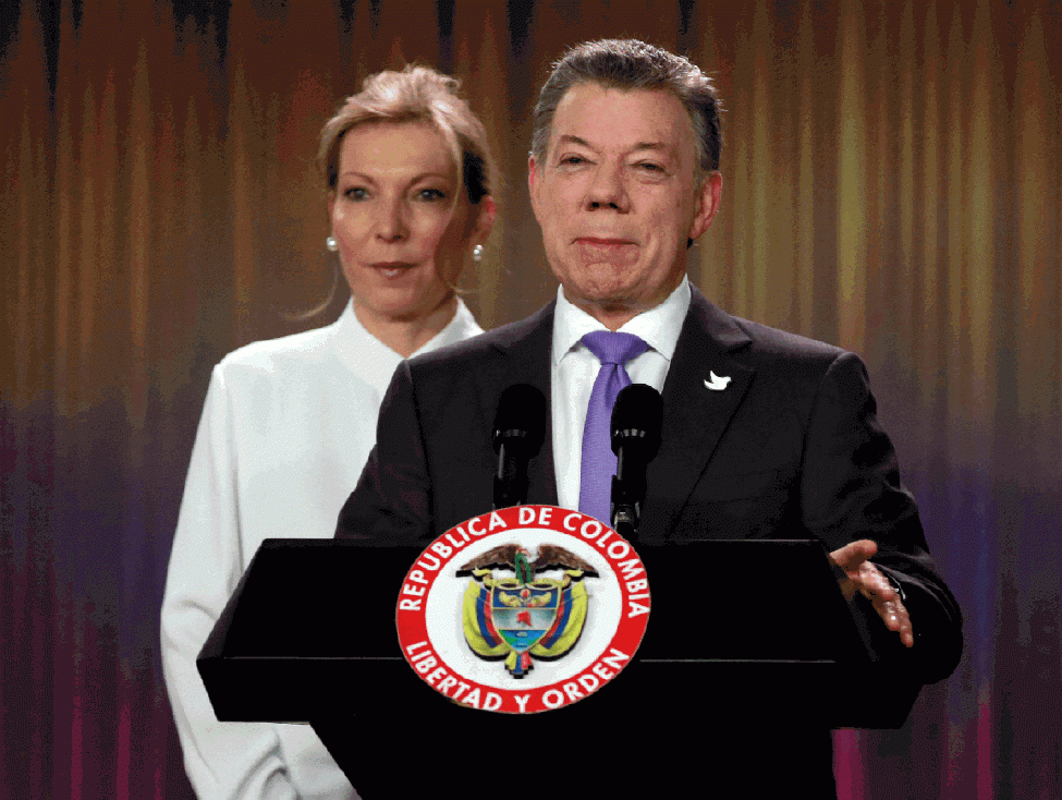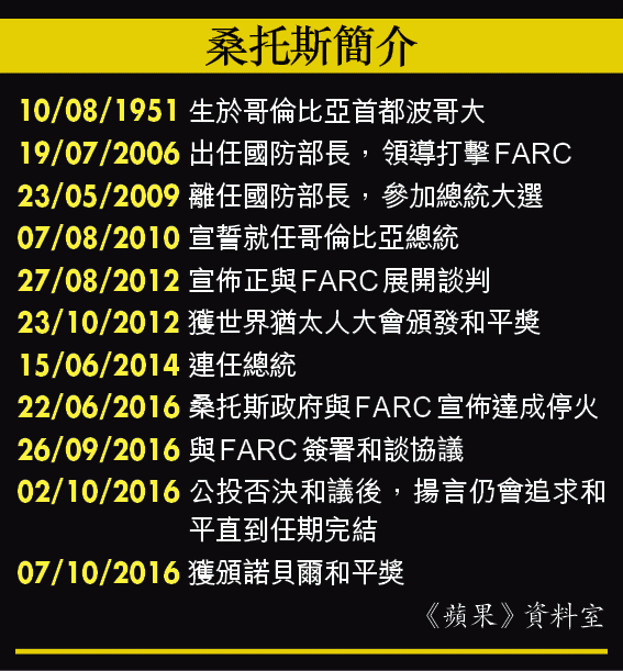 挪威諾貝爾委員會指1964年開打的哥倫比亞衝突,是現代其中一場最長、也是美洲現時碩果僅存的武裝衝突,至少令22萬人死、近600萬人流離失所。桑托斯四年前啟動跟左翼游擊隊「哥倫比亞革命武裝力量」(FARC)和談,上月達成和議,但被指對叛軍太寬容,尤其是保證他們棄械後可組黨、獲國會議席,和議在公投以不足0.5個百分點得票率之差被否決。