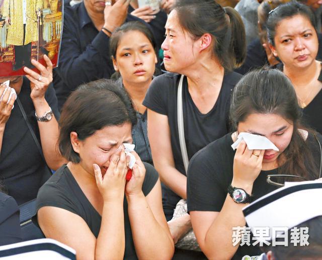 昨日下午的曼谷,縱使氣溫高達33℃,但無阻民眾湧到醫院道別一代仁君。移送遺體儀式原定下午1時舉行,但遲遲未開始。醫院外馬路旁則一早坐滿前來致哀的民眾,他們穿起清一色的黑衣,手持泰王肖像及象徵泰王的黃色旗幟。有人眼泛淚光甚至痛哭,有人雙手合十跪下祈禱。由於天氣炎熱,有民眾在等候期間不適暈倒。大批警察及軍人在醫院附近範圍駐守,又指示所有在場市民必須坐下肅靜。