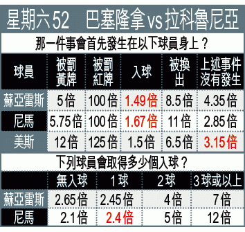 巴塞隆拿上輪聯賽爆冷不敵切爾達,而且同樣受「FIFA病毒」影響,守將佐迪艾巴與沙治羅拔圖皆受傷,不過料有美斯復出,另一鋒線主力尼馬則在周二巴西擊敗委內瑞拉的世盃外停賽,可提早歸隊,周六主場迎戰拉科魯尼亞穩贏,[-2]「主勝」可捧。(球賽編號:星期六52;now632台今日10:15pm直播)