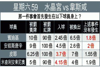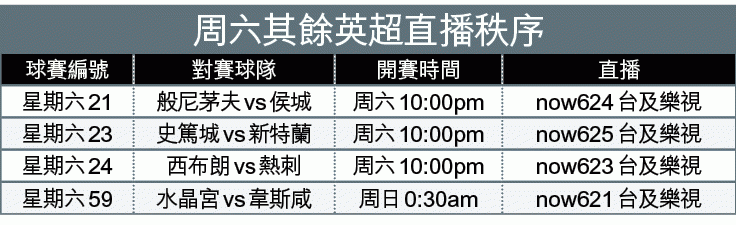 同日其他英超有尾場倫敦打吡,由水晶宮主場對韋斯咸,韋斯咸上仗賽和米杜士堡終止聯賽四連敗,中場皮耶見回勇,面對擅守不擅攻的水晶宮,受讓平/半取下盤。而般尼茅夫主場對侯城,侯城剛由菲倫正式接任領隊,但球隊整體戰力仍弱,信般茅可追打「落水虎」,贈侯城英超四連敗,主隊讓半/一可熱捧上盤。