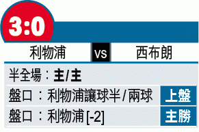 利物浦在周一雙紅會贏形勢下卻未能贏波,周六英超續於主場出擊,面對守力不錯的西布朗,紅軍中場韋拿杜姆可望復出,攻守更平衡,可望大勝西布朗向榜首施壓,紅軍讓球半/兩球,照捧上盤。