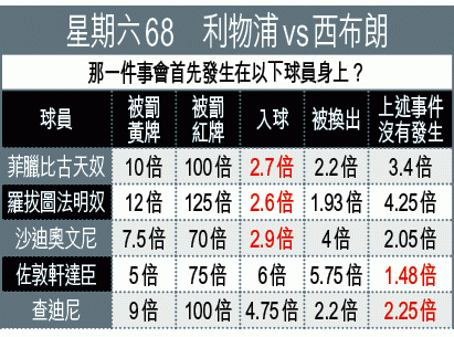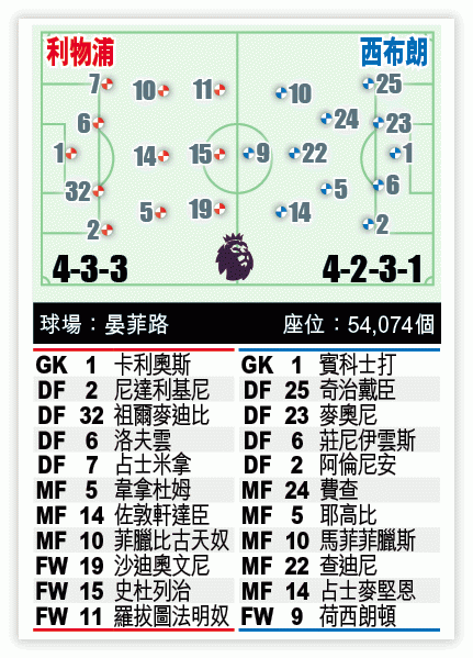 西布朗陣容尚算完整,今仗亦可強陣出擊,但射手荷西朗頓腳風已不及季初,連同國際賽代表委內瑞拉,已經連續四仗交白卷。預期西布朗領隊普利斯將先求穩守,目標以一分為先,但後防莊尼伊雲斯及奇治戴臣均非速度高,中場線如費查等更呈老化,就算上季兩遇利物浦均保不敗,但以紅軍已建立高速系統,西布朗勢在晏菲路慘敗而回。文:牽牛